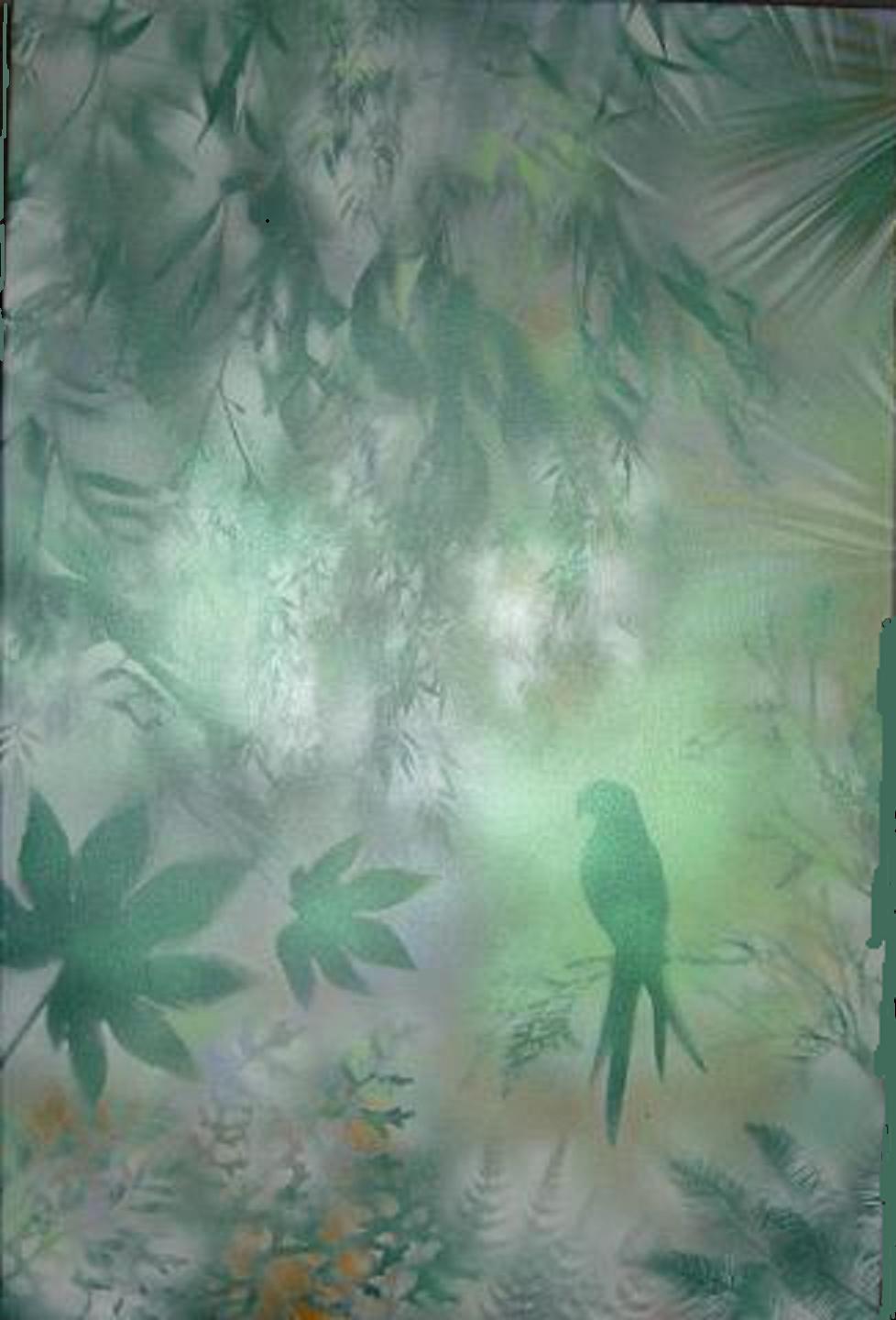 Dawn in Paradise is a spray painting, I call “Sprainting”, on canvas, iridescent finish.